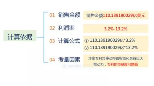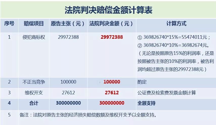 1华为诉三星案,案号:(2017)闽民终501号 在该案中,原告索赔的金额为8000万元,一、二审法院判决都全额支持了原告的诉讼请求。本案的基本数据包括: 01 确定销售数额 华为公司提交了经公证的IDC数据来佐证涉案移动终端的销售数量,IDC公司作为全球性的数据提供商,其所提供的数据有一定的可信度和参考价值。本案涉案移动终端销量为28375966台,销售金额为110.139190029亿美元。 另外,考虑到IDC数据仅为惠州三星公司等三公司在中国地区销售涉案移动终端的数量统计,并不包含其在中国制造并出口的涉案移动终端的销售数据,惠州三星公司等三公司实际销售金额应当超过IDC统计数据。原审法院以IDC数据作为考量基准,并无不当。 02 确定利润率(利润区间在3.2%---13.2%) 华为公司提供了经公证的“三星电子株式会社2015年财报”,用以证明三星集团在其官网所披露的销售利润率为13.2%。 虽然三星电子株式会社并非本案的当事人,但鉴于其为本案三被告的上级投资集团公司,所公布的利润率具有一定的参考价值,而且,根据三被告提供的工信部2014年针对国产手机的调查数据可知,国产手机的“行业平均利润率为3.2%,低于电子制造业平均水平1.7个百分点”。 03 计算公式 本案涉案移动终端销量为28375966台,销售金额为110.139190029亿美元。该利润区间的最低值以国产手机平均利润率为计算依据,具体数值为3.52445408亿美元(IDC统计的涉案移动终端的销售额110.139190029亿美元×2014年国产手机平均利润率3.2%),最高值以三星电子株式会社官网披露的销售利润率为计算依据,具体数值为14.5383731亿美元(IDC统计的涉案移动终端的销售额110.139190029亿美元×三星电子株式会社官网披露的销售利润率13.2%)。 若不考虑精确的人民币与美元的汇率问题,假定以汇率6.5为计算依据,那么以人民币为货币单位计算而得的利润区间大致22.908951526032至94.499425044882亿人民币之间。 惠州三星公司等没有举证证明应当扣除的其他合理利润,考虑涉案专利对侵权获利具有较高贡献率,原审法院酌情确定的8000万元应属合理。 04 专利技术具有较高的贡献度 基于操作简便、交互方式友好的图形操作界面在增强用户粘性、提升品牌认可度、增加产品销售额等方面的作用,可以认定图形操作界面对智能移动终端产品的利润具有实质性贡献。 另外,涉案专利申请日为2010年1月28日,此时智能手机尚未普遍推广,用户还不熟悉多屏桌面,涉案专利创造性地提出了长按组件缩小页面的方案,启发性地引导消费者熟悉并充分使用多屏桌面,且该操作简便,涉案专利具有较高创造力、对移动终端智能化具有巨大推动力。 由于该专利属于非标准必要专利,在移动终端的制造过程中是否使用具有可选择性。然而被告在制造、销售的众多型号的智能移动终端产品中,均使用了本案涉案专利的技术方案,可见该专利的市场认可程度极高。 05 以下对法院判决赔偿金额简要归纳如下: 2北京稻香村诉苏州稻香村案(一审),案号:(2015)京初民初字第1606号 在该案中,原告索赔的金额为3000万元,一审法院判决全额支持,这在司法实践中,相对来说还是比较少见的。本案的基本数据包括: 01 确定销售数额 法院根据原告的申请,调取了天猫商城和京东商城的销售数据,其中:被告在天猫商城中2016年4月-2017年6月的的销售数额为151647423.4元,每个月平均销售数额为10109828元;被告在京东商城中2015年9月-2017年12月的销售数额为4567851.9元,每个月平均销售数额为163137元。 02 确定利润率 原告主张依据其2010-2013年审计报告的记载,其2010-2013年的利润率分别为14%、12.8%、15.9%、16%,平均利润率为15%。被告则主张其利润率只有10%。 ▼ 03 计算公式 以天猫商城和京东商城为例,自原告发现涉案被诉侵权行为至今,其销售数额自2015年9月至2018年8月应为10272965*36=369826740元,参照原告主张的销售糕点类商品15%的利润率,即使按照被告销售被诉侵权产品的利润率为10%计算,其利润总额亦超过3000万元,已经超过了原告请求的经济损失数额29972388元。 按照以上利润率分别计算如下: 369826740*15%=55474011元(远远超过原告主张的3000万元) 369826740*10%=36982674元(超过原告主张的3000万元) ▼ 04 考量因素(贡献度) 同时考虑“稻香村”相关标识的显著性和知名度、被告的涉案商标侵权行为的主观情节、相关网络电商平台销售范围、被诉侵权标识在侵权获利中的贡献度等因素,本院对原告请求的侵害商标权的经济损失赔偿数额予以全额支持。 05 不正当竞争的经济损失赔偿数额予以全额支持 对于涉案不正当竞争行为给原告造成的损失,考虑到被告虚假宣传的内容为将南味糕点宣传为“北京特产”导致消费者的进一步误解,从而与原告的相关市场产生进一步混淆,以及被告将与最高人民法院第85号裁定涉及的不予核准注册的商标标识相近似的标识宣传为“江苏省著名商标”等情节,本院对原告请求的涉及不正当竞争的经济损失赔偿数额予以全额支持。 06 维权的合理开支 根据原告稻香村提交的在案证据,其支出的公证费用的发票数分别为8000、5000、3000、5120、2000元,检索费发票数额为4492元,总计共27612元,因上述费用均由相关的票据在案佐证,应由被告北京稻香村、苏州稻香村负担。 07 以下以表格方式对法院判决赔偿金额进行梳理。 3总结 根据以上案例,可以归纳出高判赔金额的计算方式: ① 首先需要确定的是被