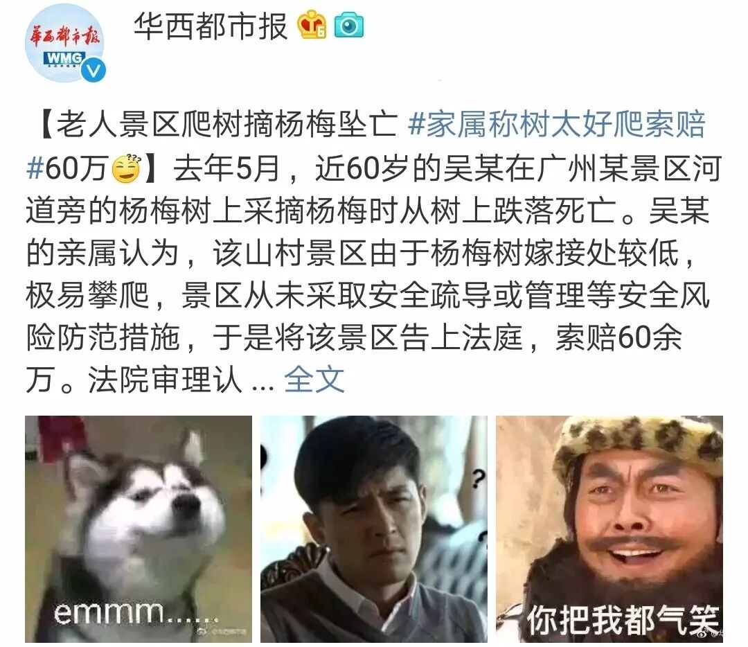 昨天刷微博看到了一条名为“树太好爬索赔60万元”的新闻引发网友热议。点开新闻真的是让人惊奇:广州六旬老人吴某在景区游玩上树摘杨梅时,由于树枝枯烂断裂,致吴某从树上跌落,经送医院抢救无效身亡。